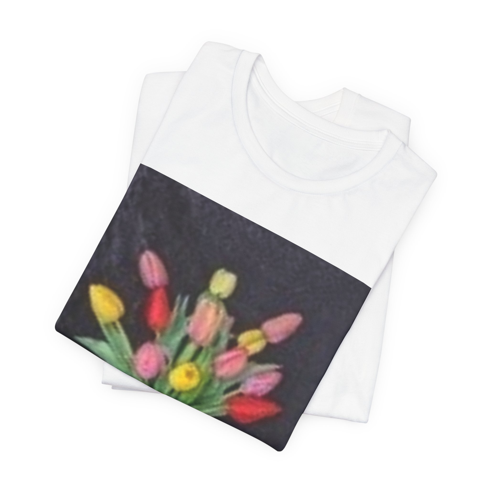 Soft, breathable tee with a hand-painted bouquet print that feels like sunlight on a windowsill. Lightweight Airlume cotton drapes easily and keeps you cool during slow mornings and city strolls. The ribbed crew neck and side seams hold a clean shape, while the tear-away label keeps it comfortable against skin. The tulip canvas — warm pinks, sunny yellows, and gentle greens against a deep background — reads like a quiet moment captured and worn close to the heart. Wear it with denim or under a cardigan for relaxed layers that carry a little floral calm to coffee dates, gallery visits, or weekend gardening chores.