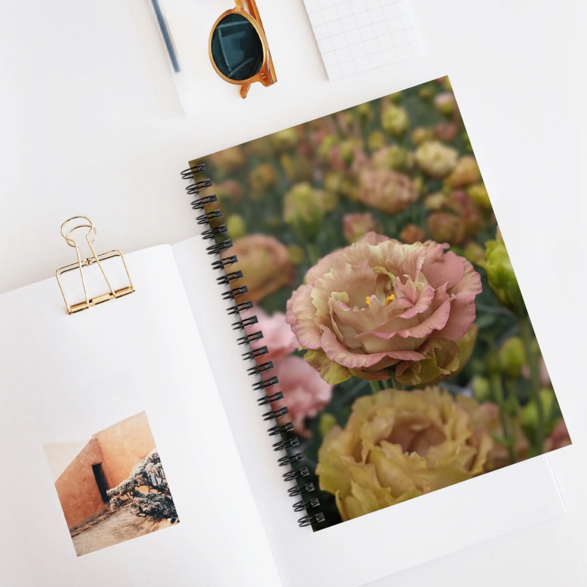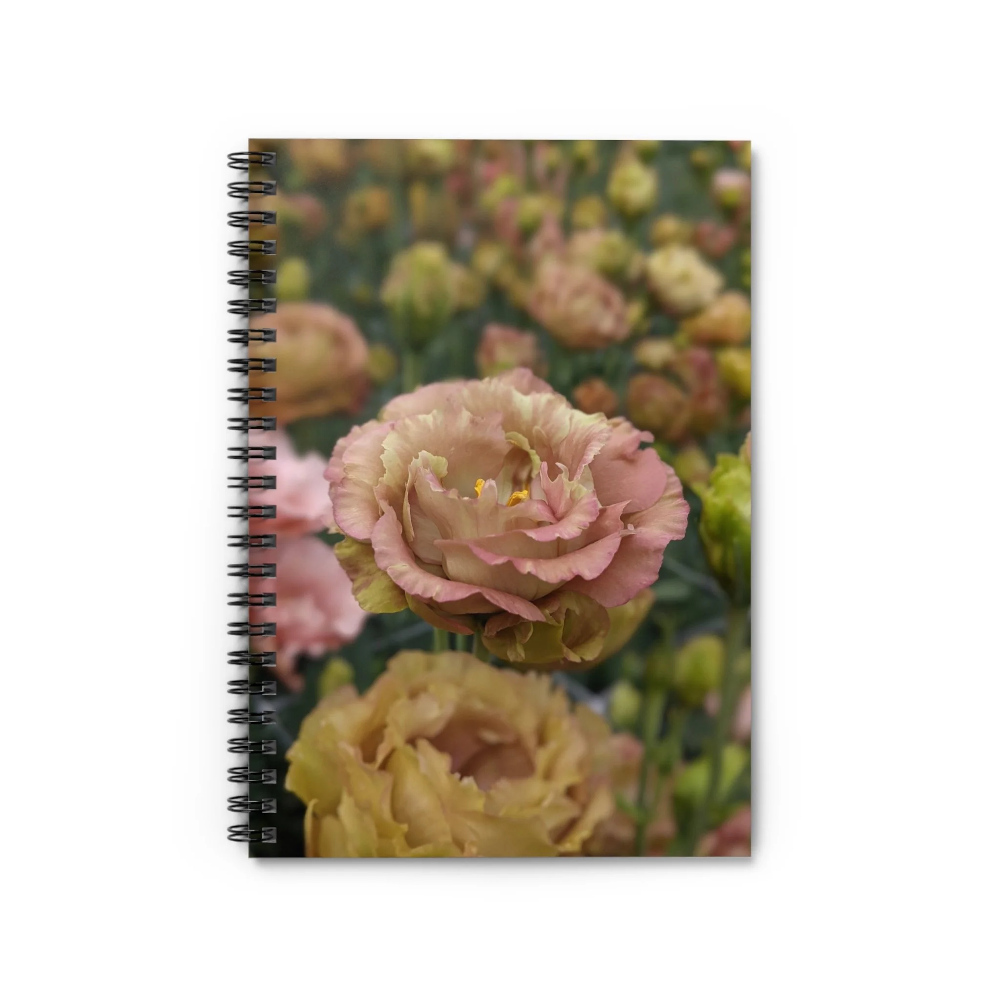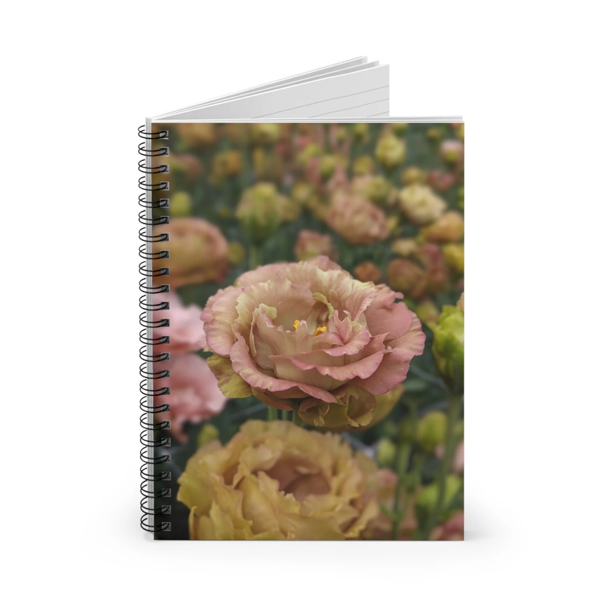 This 6" x 8" spiral notebook opens like a quiet exhale. A garden full of lisianthus blooms grace the front cover — soft petals and gentle curves that invite slow thoughts, grocery lists, half-formed poems, or daily plans. Tuck receipts, ticket stubs, or sticky notes into the inner document pocket so ideas stay with the pages that sparked them. The metal spiral lies flat for left or right-handed writers.